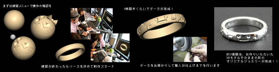 実際にはこのように制作します 所要時間は約2時間 3Dモデル完成後、約3週間でオリジナルジュエリーに